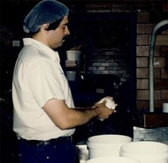 Lawrence Hickey stretching fresh Mozzarella. May, 1985