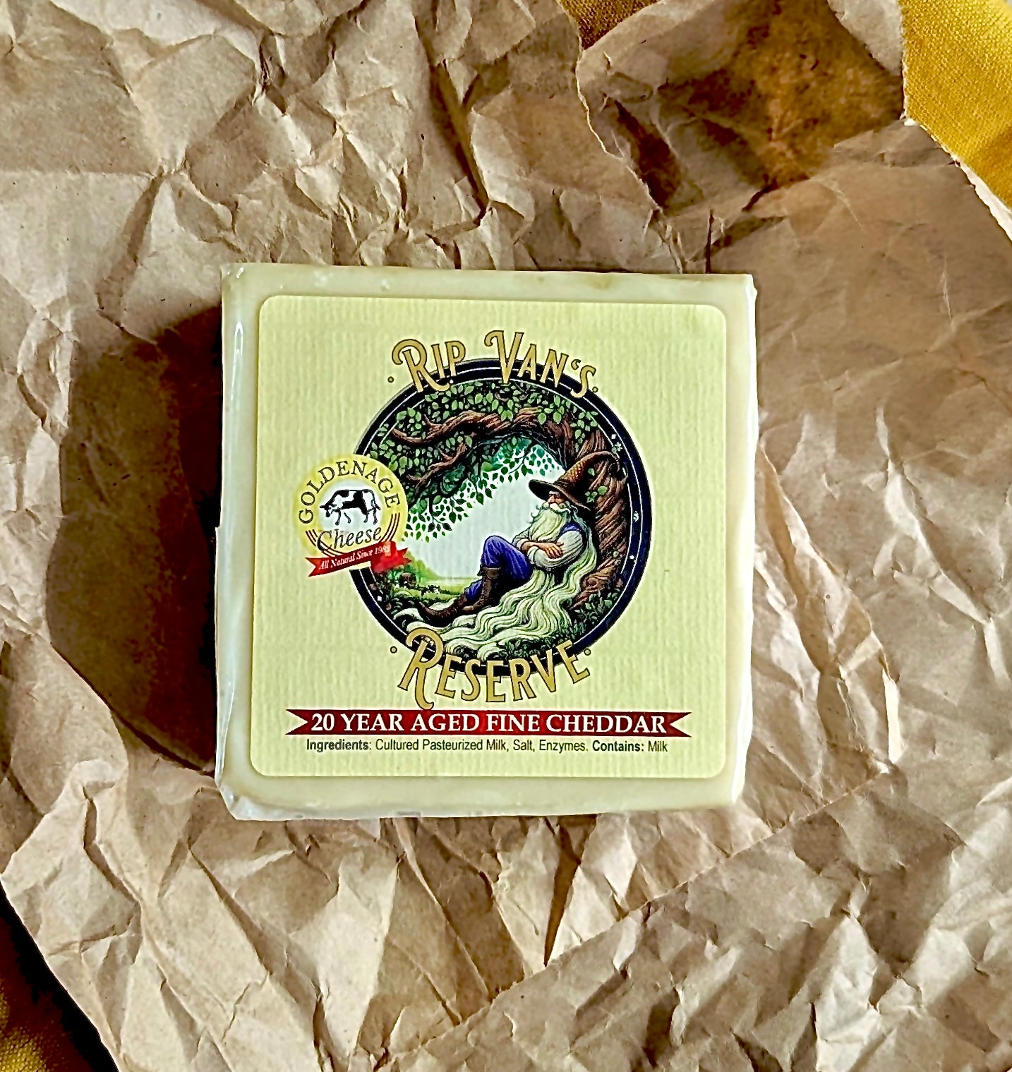 Just like the character himself, this hand-crafted, white cheddar was left to slumber (happily on our aging shelf) 20 years ago, only to awaken in 2024 as Golden Age Cheese's newest and oldest offering! "Rip Van's Reserve" is a meticulously aged, white, New York Cheddar that shows its true age and maturity in each bite!